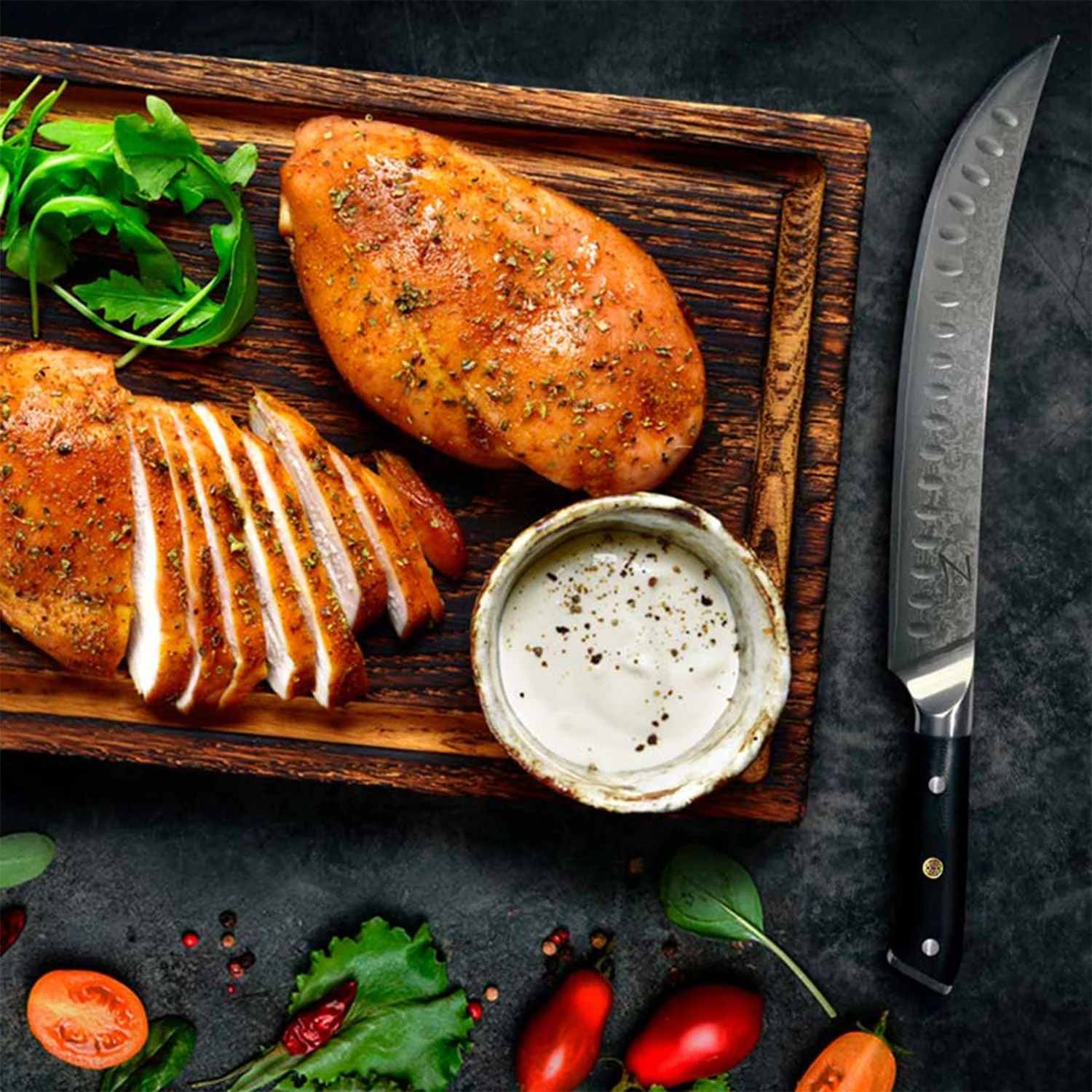 Das Zelite Infinity by Klarstein Alpha-Royal Japanese 10″ Fleischermesser überzeugt durch Präzisionsschnitte, denn es verfügt über eine 9 – 12° Kantenschärfe mit einem spiegelpolierten Schneidewinkel. Dank der einmaligen Schärfe und der Einkerbungen in der Klinge wird es dir besonders leicht fallen, auch große Stücke Wildfleisch sauber zu zerlegen. Dank minimalem Schnittwiderstand gleitet das professionelle Metzgermesser fast wie von selbst durch Rind, Schwein, Geflügel oder Fisch und durchtrennt diese mit Leichtigkeit und präzisen Schnitten.