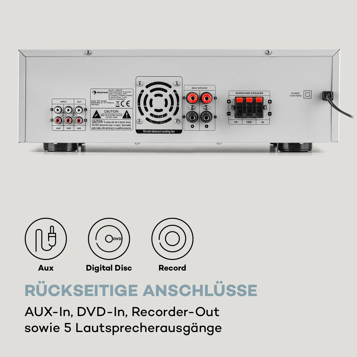 Kompakt, leistungsstark und vielseitig: Mit dem auna AMP-218 BT 5.1-Surround-Verstärker erhält das Heimkino seine intelligente Klangoptimierung.