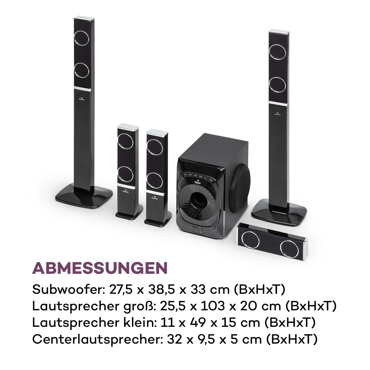 - Subwoofer: 27,5 x 38,5 x 33 cm (BxHxT)