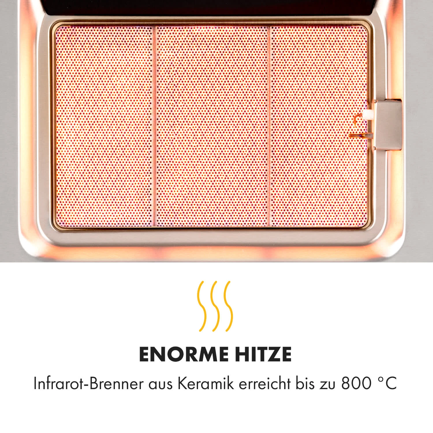 Für ein schnelles Starten des Infrarot-Brenners sorgt das SNAP-JET Ignition-System mit zuverlässiger Piezo-Zündung: Ein Klick genügt, schon ist der Grill betriebsbereit. Durch die enorme Gesamtleistung mit IR Boost und 12.000 BTU/3,5 kW kann der Gasgrill nun verschiedenste Speisen mit einer Temperatur von bis zu 800 °C grillen. Aufgrund des praktischen Grillkorbs können mit dem Crossfire Gasgrill nicht nur Steaks oder Burger gegrillt, sondern auch verschiedene andere Fleisch-, Fisch- und Gemüsesorten gegart werden. Eingestellt wird die gewünschte Hitze einfach über ein großes Drehrad, das seitlich in das Gehäuse eingelassen ist. Zusätzlich lässt sich der Grillkorb selbst in verschiedenen Abständen zur Hitzequelle aufhängen. Durch die hohen Temperaturen gelingt außen alles kross und innen zart, anfallendes Fett und eventuell austretende Flüssigkeiten sammeln sich in der Auffangschale unterhalb des Grillkorbs.