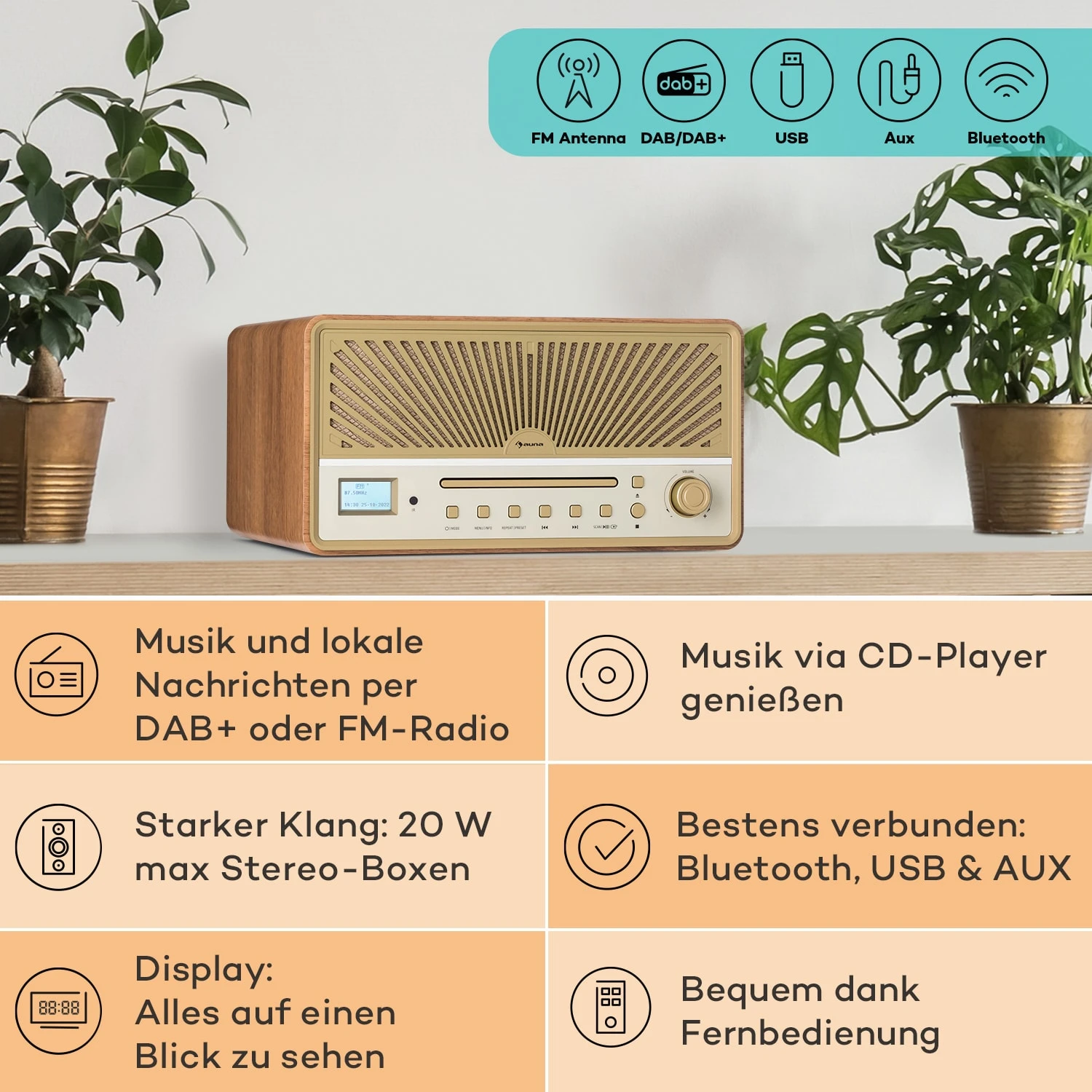 Mit dem auna Glastonbury DAB Radio mit CD-Player erlebst du einen modernen Weltempfänger, welcher dank beeindruckendem Retro-Design deinen Wohnraum verschönert. Egal ob Rock, Pop, Jazz, Klassik oder spannende News aus der ganzen Welt – mit dem Glastonbury bist du immer auf Empfang – glasklar in digitalem DAB-Sound oder ganz klassisch als Kurzwellenempfänger. Daneben kannst du über das Gerät auch deine gesamte CD-Sammlung abspielen und andere Audiowiedergabe-Geräte wie PC, Laptop oder Smartphone anschließen. Dafür verfügt das kompakte Radio rückseitig über einen Line-In-Anschluss sowie einen USB-Port: Einfach deinen USB-Stick anschließen und deine Lieblingsmusik im MP3-Format genießen.
