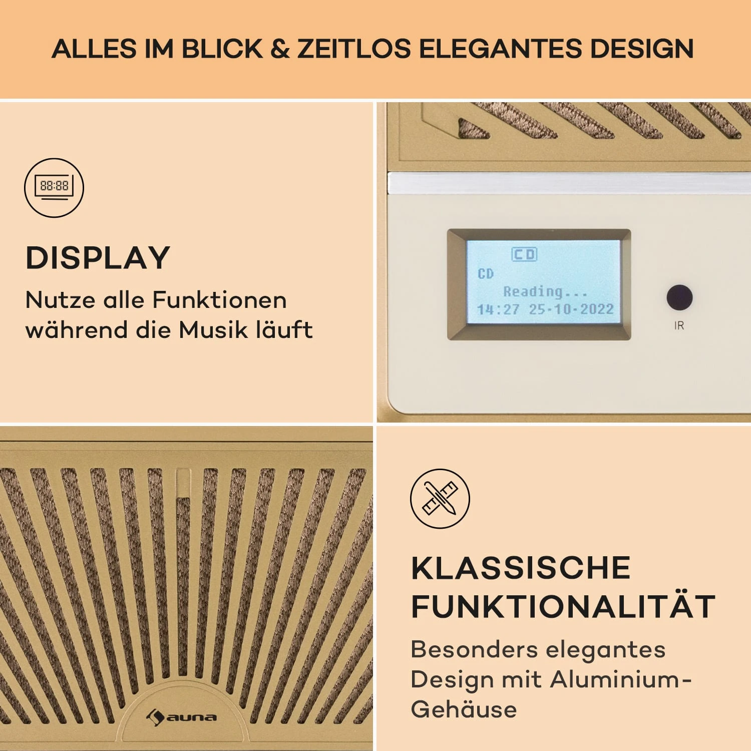 - frontseitiges Display, Bedientasten und Lautstärkeregler frontseitig