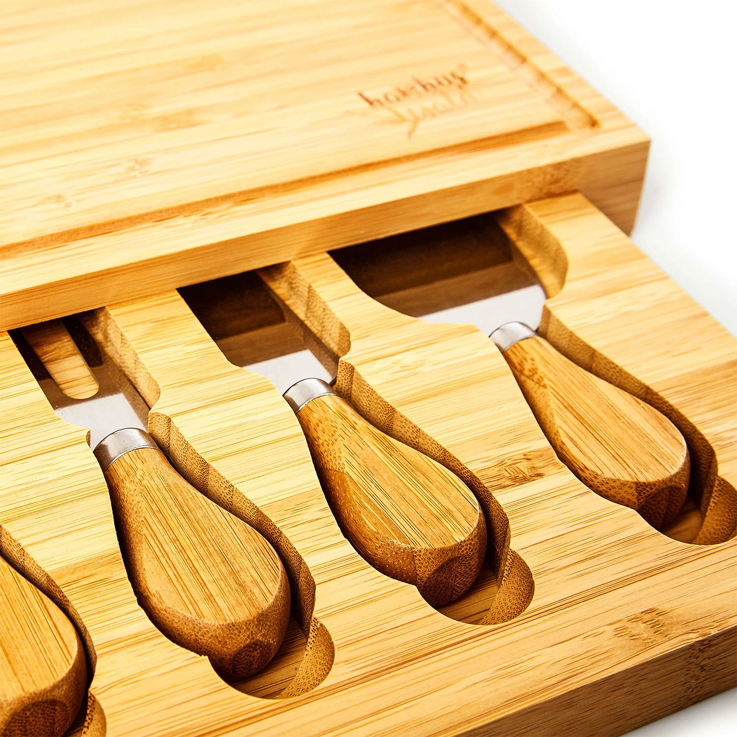 Das Käsebrett mit Messerschublade von Klarstein sorgt für entzückte Gesichter! Bei der Zubereitung von Brunch-, Brotzeit- und Käsespezialitäten eilt dir das präzise verarbeitete Bambusbrett zur Hilfe. Vier Spezialmesser helfen dir beim Anrichten. Das Käsebrettchen dient als klingenschonende Schneideplatte und als Servierplatte. Das Zero Waste Brettchen ist recycelbar und kompostierbar.