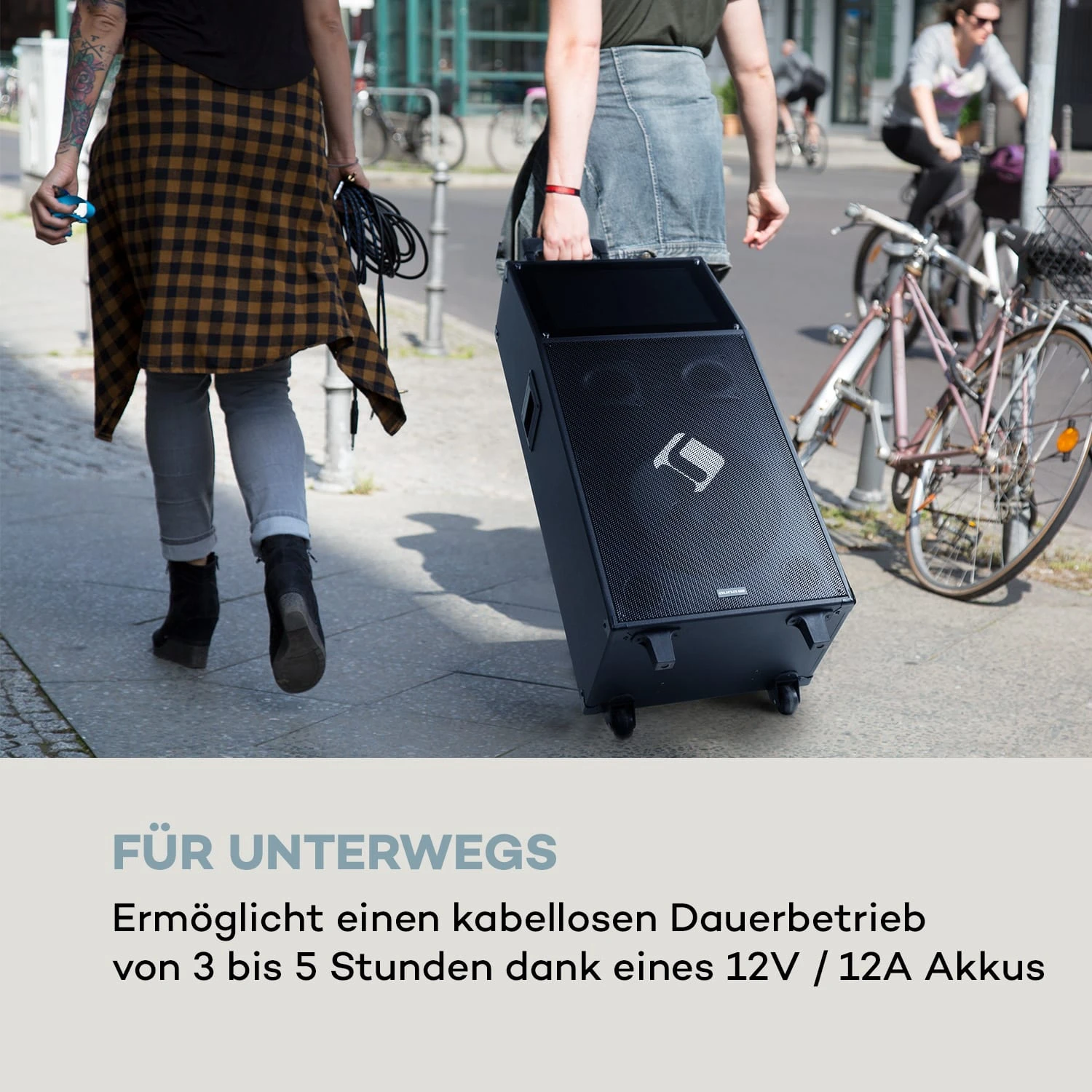 - Stromversorgung: 100-240 V~ | 50/60 Hz (Stromnetz) oder per 12V/12A Akku