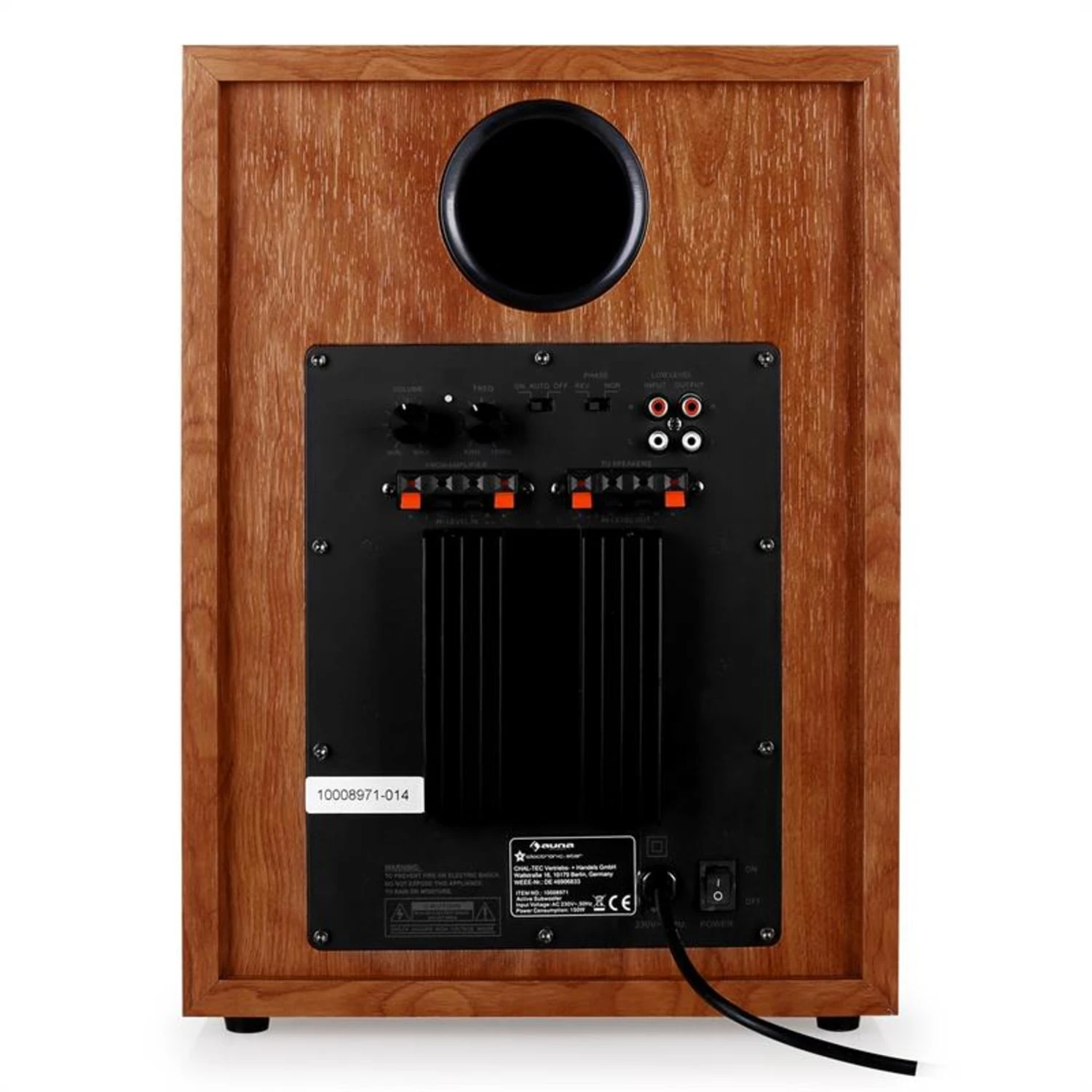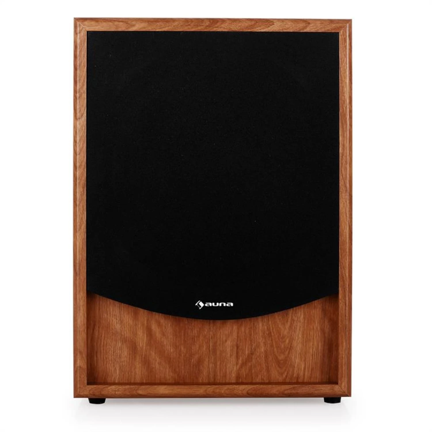 Für ein harmonisches Zusammenspiel mit verschiedenen Wohneinrichtungen schmückt sich der auna Tieftonlautsprecher mit einer eleganten Formensprache, einem Gehäuse mit Walnuss-Finish sowie abnehmbarer Lautsprecherabdeckung.