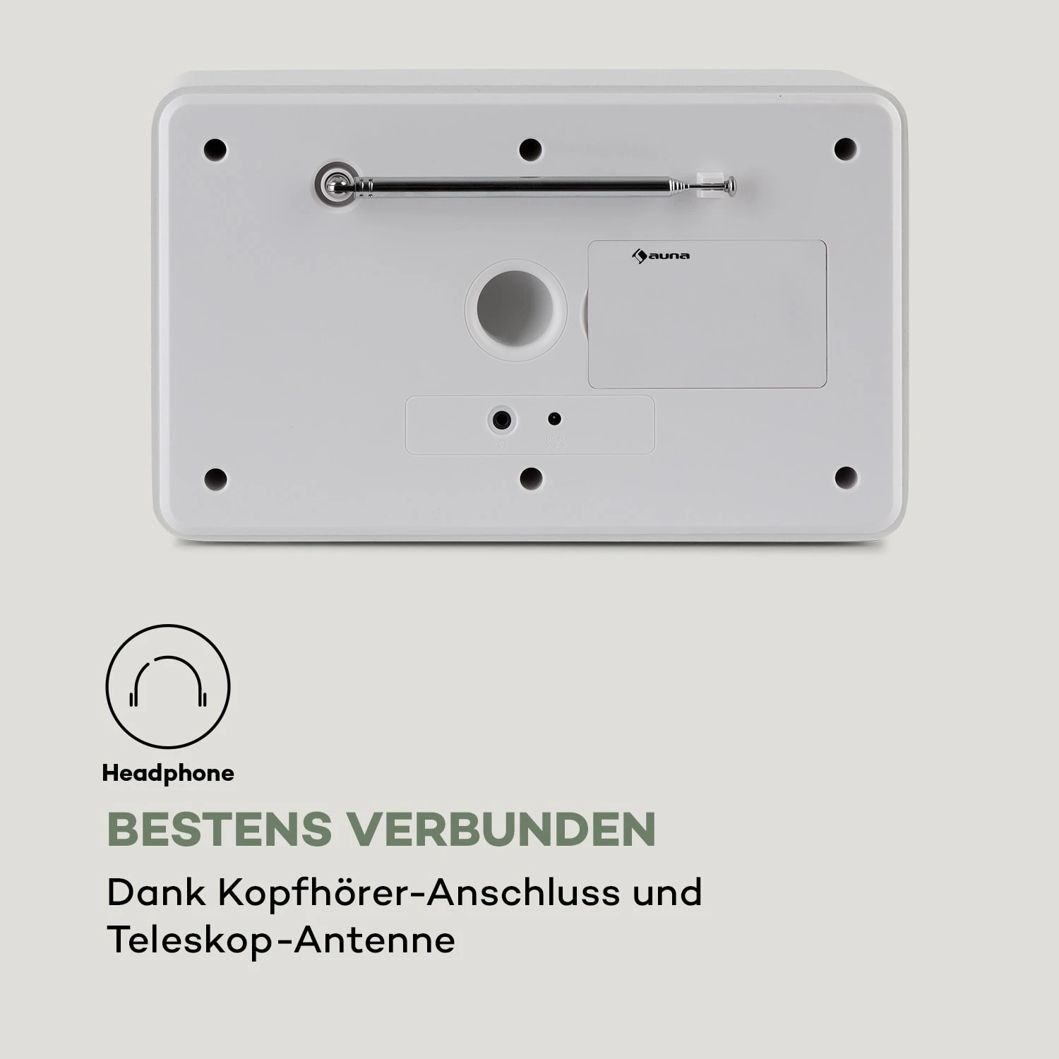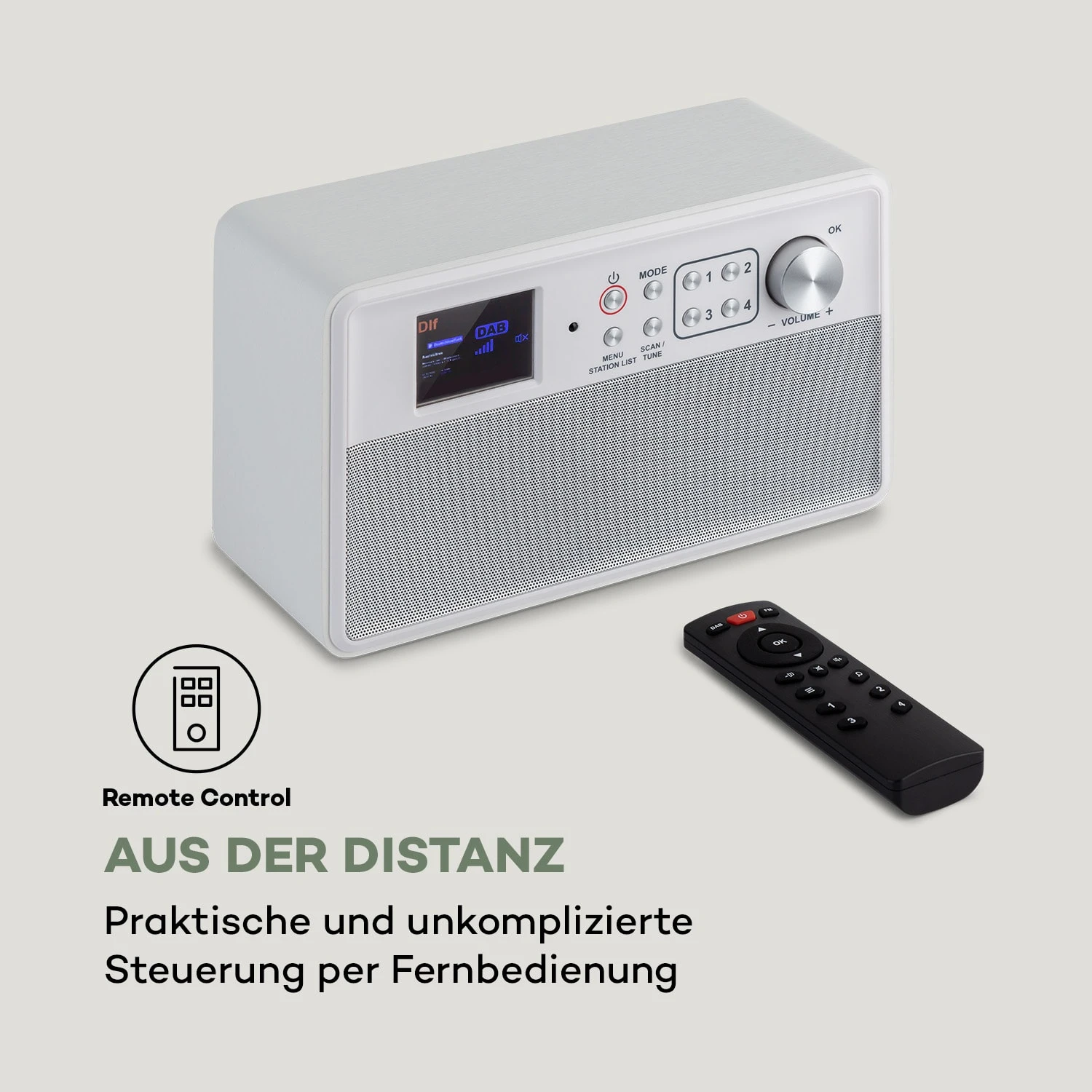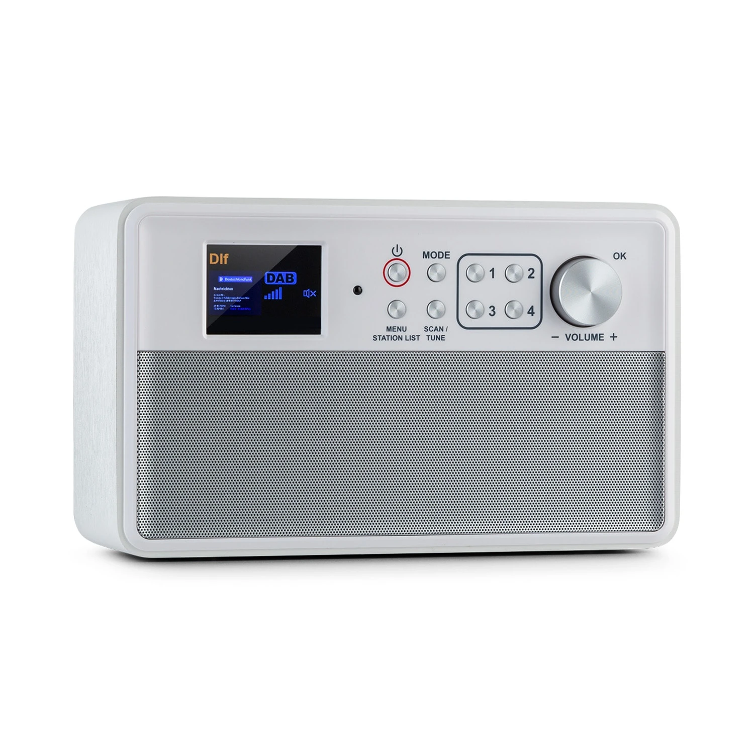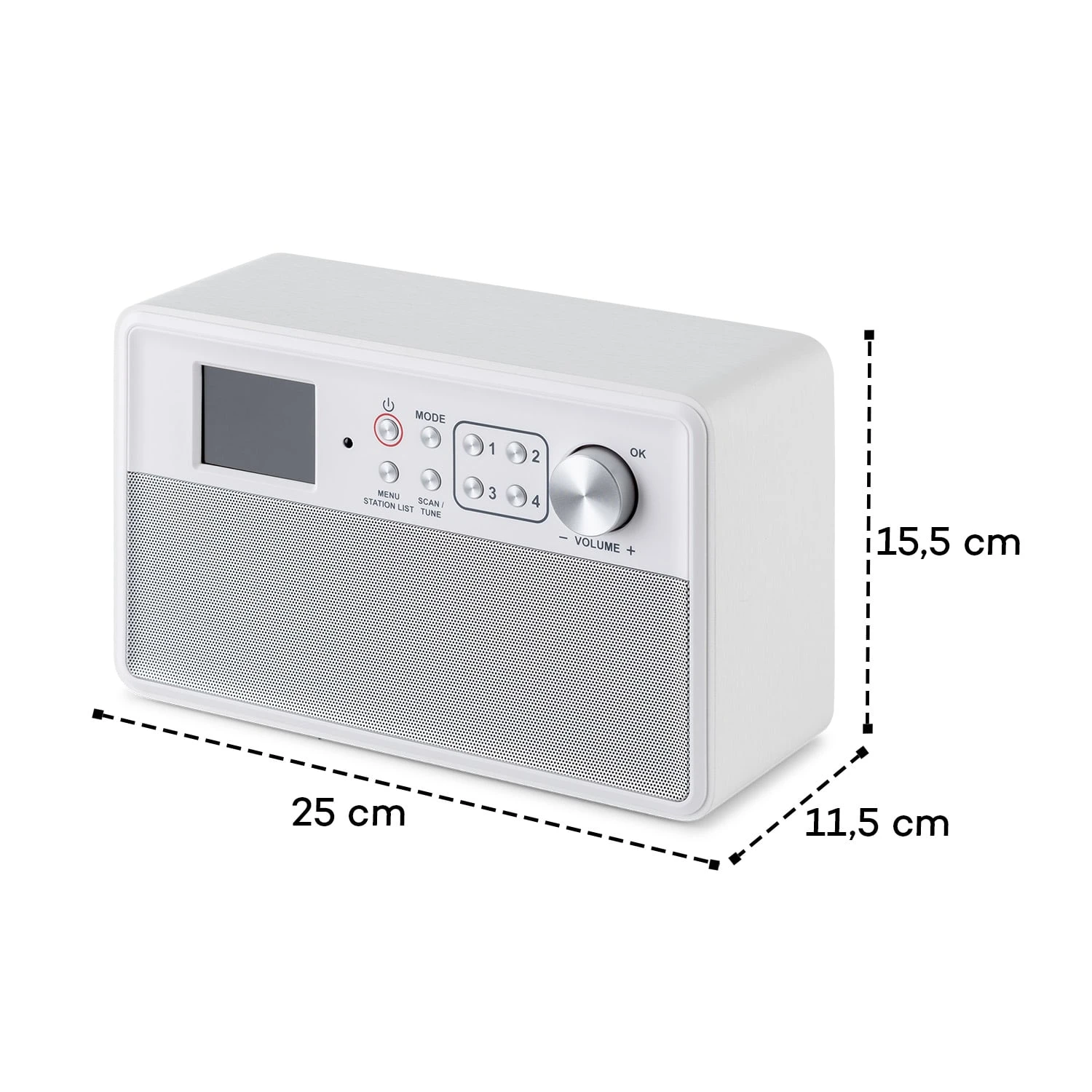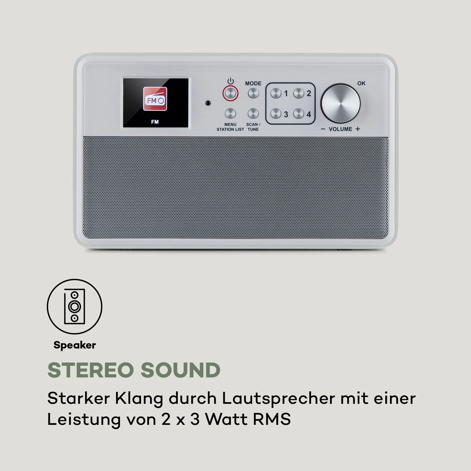 Die stilvolle Klangbox mit einer Leistung von 2 x 3 Watt RMS ist mit einem DAB+ sowie einem UKW-Radiotuner ausgestattet, die sowohl für den digitalen als auch analogen Empfang aller Sender in näherer Umgebung zuständig sind. Dank RDS werden außerdem nützliche Zusatzinformationen zu Radiostationen, Musiktiteln oder Alben angezeigt. Die Steuerung des Gerätes gestaltet sich durch das 2,4″ TFT-Farbdisplay mit extra großen Zahlen und Buchstaben jederzeit übersichtlich und erfolgt über die leichtgängigen Druckknöpfe am Gerät sowie mittels beiliegender Fernbedienung. Neben der vergrößerten Display-Anzeige sind für Senioren und Kinder vor allem die wählbaren Betriebsmodi vorteilhaft: So wird im Basismodus eine partielle Tastensperre ermöglicht, um eine Fehlbedienung und ein Verstellen der Einstellungen zu vermeiden. Nur die Ein-/Aus-Taste, die Einstellung der Lautstärke sowie die Tasten für 4 Speicherplätze sind hierbei freigegeben, während im Standardmodus sämtliche Funktionen, wie Sendersuchlauf, Senderlisten und Einstellungen freigeschaltet sind. Per Kopfhörer-Eingang kann zudem auch während der späten Abendstunden jederzeit dem Musikgenuss nachgegangen werden. Mit seinem eleganten und zurückhaltenden Design fügt sich das handliche Radio darüber hinaus perfekt in jedes Wohnambiente ein.