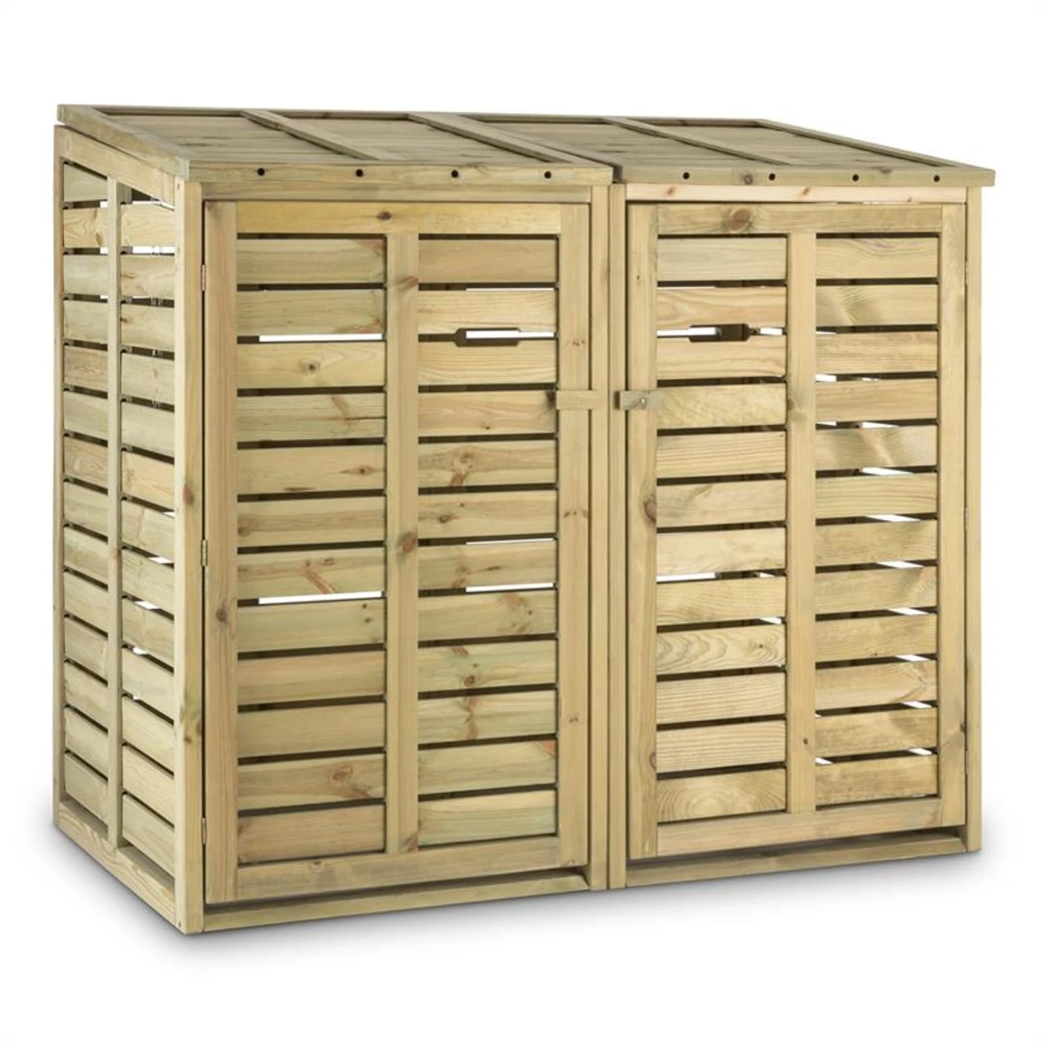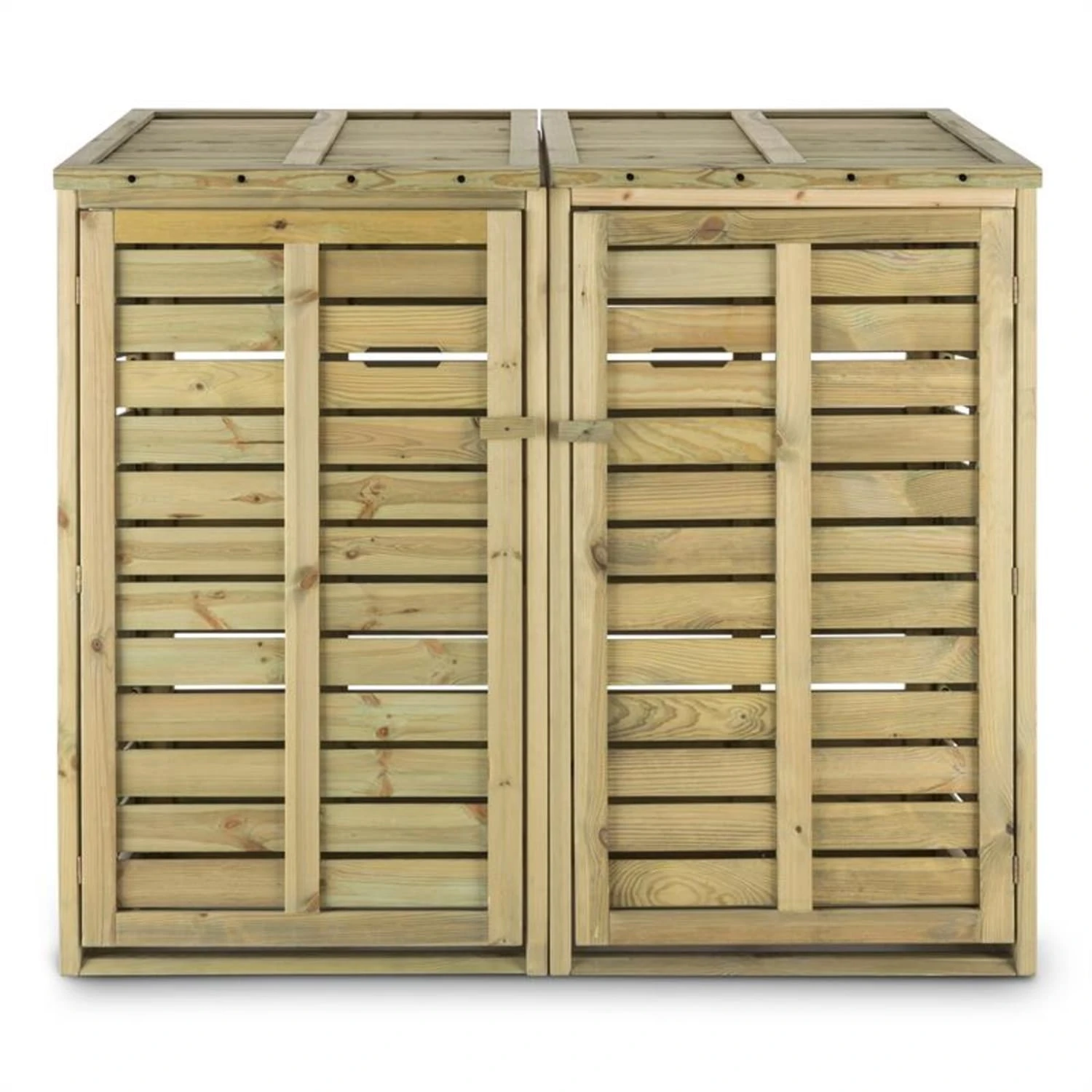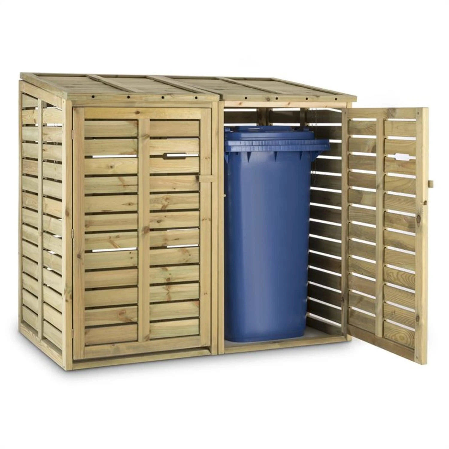 Die Waldbeck Ordnungshüter 2T Mülltonnenbox bringt Ordnung in die letzte Ecke des Außenbereichs. Massives Kiefernholz aus FSC®-zertifizierter, nachhaltiger europäischer Forstwirtschaft verleiht der Box nicht nur Stabilität, sondern auch ein Äußeres, das man gern ansieht. Bis zu zwei Mülltonnen mit einer Größe bis 240 l verschwinden ganz unkompliziert im geräumigen Inneren. Zwei große Türen bieten unkomplizierten Zugang zum Verräumen, egal ob die Tonnen voll oder leer sind. Aber auch das Befüllen ist mit dem Ordnungshüter ein Klacks: Beide Klappdeckel sind mit einer Kette versehen, die im Mülltonnendeckel eingehängt wird und diesen gleich mit anhebt, wenn der Deckel der Box geöffnet wird. Zusätzliche Unterstützung beim Öffnen ist durch die vier Druckgasöffner garantiert, die den Deckel fast schwerelos machen. Für Witterungsbeständigkeit sorgt die tiefenwirksame Kesseldruckimprägnierung, die weitere Holzschutzbehandlungen überflüssig macht.
