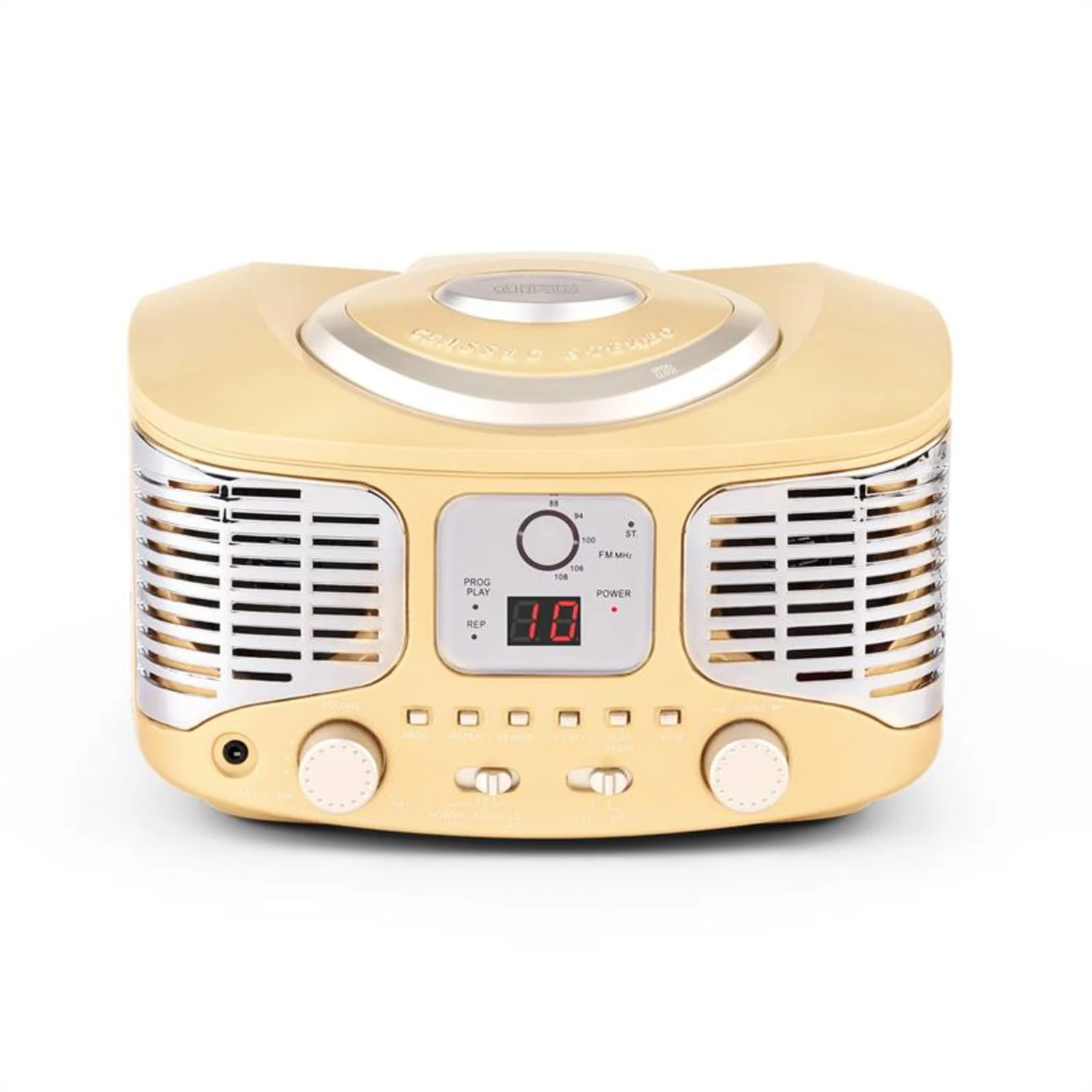 Über die beiden Drehregler können stufenlos Lautstärke und Radio-Senderfrequenz eingestellt werden. Per AUX-Eingang können Sie zudem ganz einfach Audio-Signale externer Geräte wie MP3-Playern und Smartphones wiedergeben.