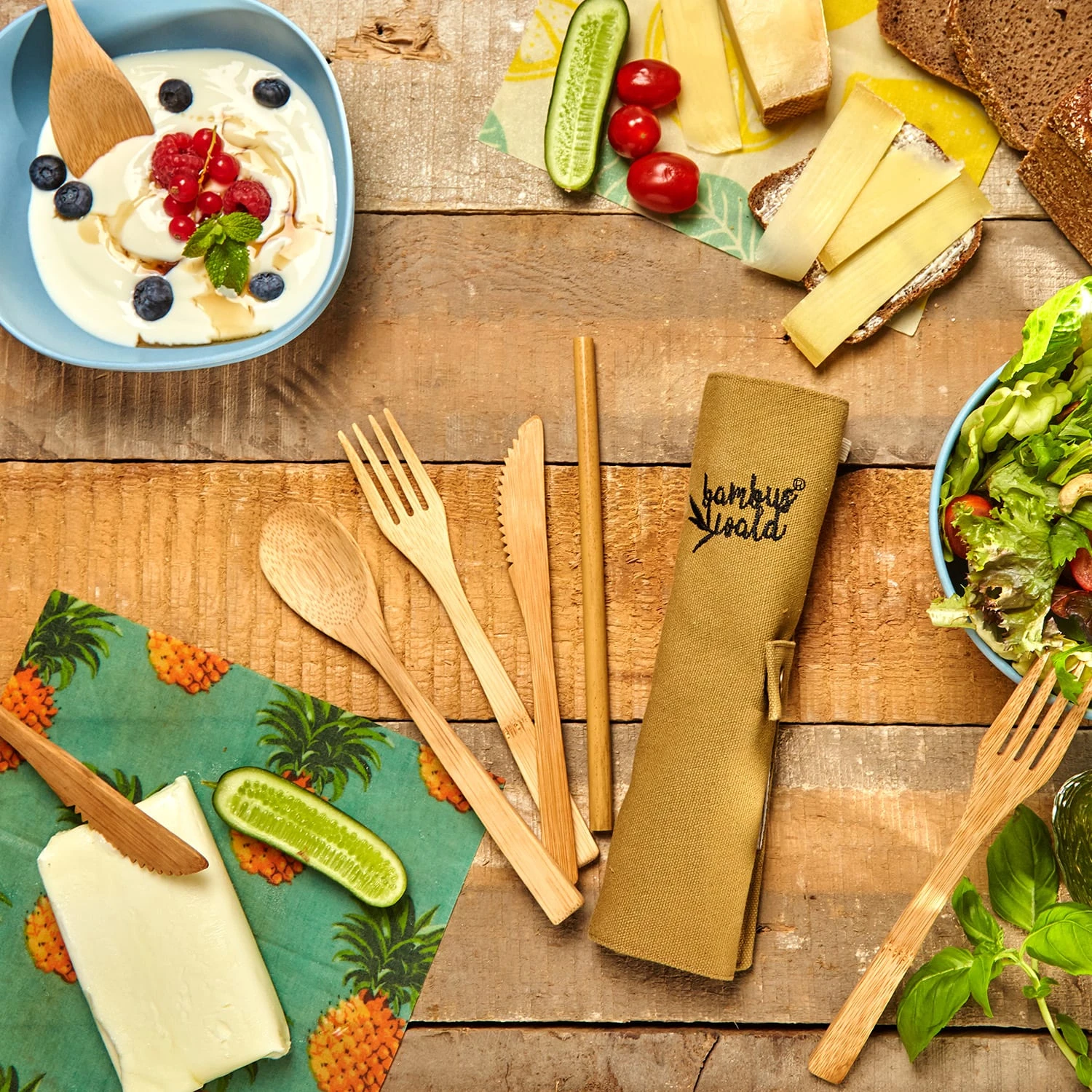Die umweltschonende Alternative zu Einmalbesteck für unterwegs: Das nachhaltige Reisebesteck in brauner Tasche von Klarstein. Dank dem unbehandelten Bambusmaterial ist das Reisebesteck von Klarstein wiederverwendbar und geschmacksneutral. Es besteht aus einem Messer, einer Gabel, einem Löffel und einem Strohhalm mit spezieller Reinigungsbürste. Kompakt verstaut in der schönen Leinen-Tasche ist es ideal, um es an jeden Ort mitzunehmen. So macht es sich gut auf Reisen, bei Wanderungen, beim Picknick oder auch für den Lunch im Büro.