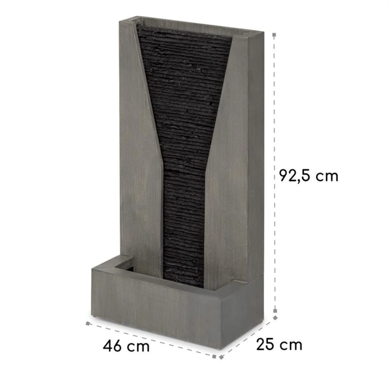 Mit dem sanften Plätschern des Blumfeldt Riverrun Zierbrunnens wird das Relaxen gleich noch mal so schön. Aus seiner großen Pforte ergießt sich eine 35 cm breite Kaskade in einem sanft plätschernden Wasserspiel in das Brunnenbecken und sorgt so für meditative Entspannung. Aber nicht nur mit dem vollen, steten Schwall des Wassers weiß der Brunnen das Auge zu erfreuen: Direkt aus dem Brunnenbecken sorgt ein funkelnder LED-Ring für das Erstrahlen des Wassers mit warmweißen Lichtreflexen. Der kubistisch angehauchte Brunnen aus verzinktem Metall ist mit einem Finish in Beton-Optik versehen, während das Wasser über eine Rückwand im Schiefer-Look rinnt. So erfreut der Riverrun optisch und akustisch das Gemüt. Dabei ist er nicht nur äußerst robust und witterungsbeständig aus Metall gefertigt, sondern auch vollverzinkt: Ohne Rost und Anlaufen fügt er sich perfekt in vielerlei Ambiente ein. Damit sich das Wasserspiel niemals erschöpft, wird es von einer 12 W starken Pumpe in stetigem Umlauf gehalten. Sanft Rauschend entfaltet es eine äußerst meditative Wirkung und erfrischt seine Umgebung.