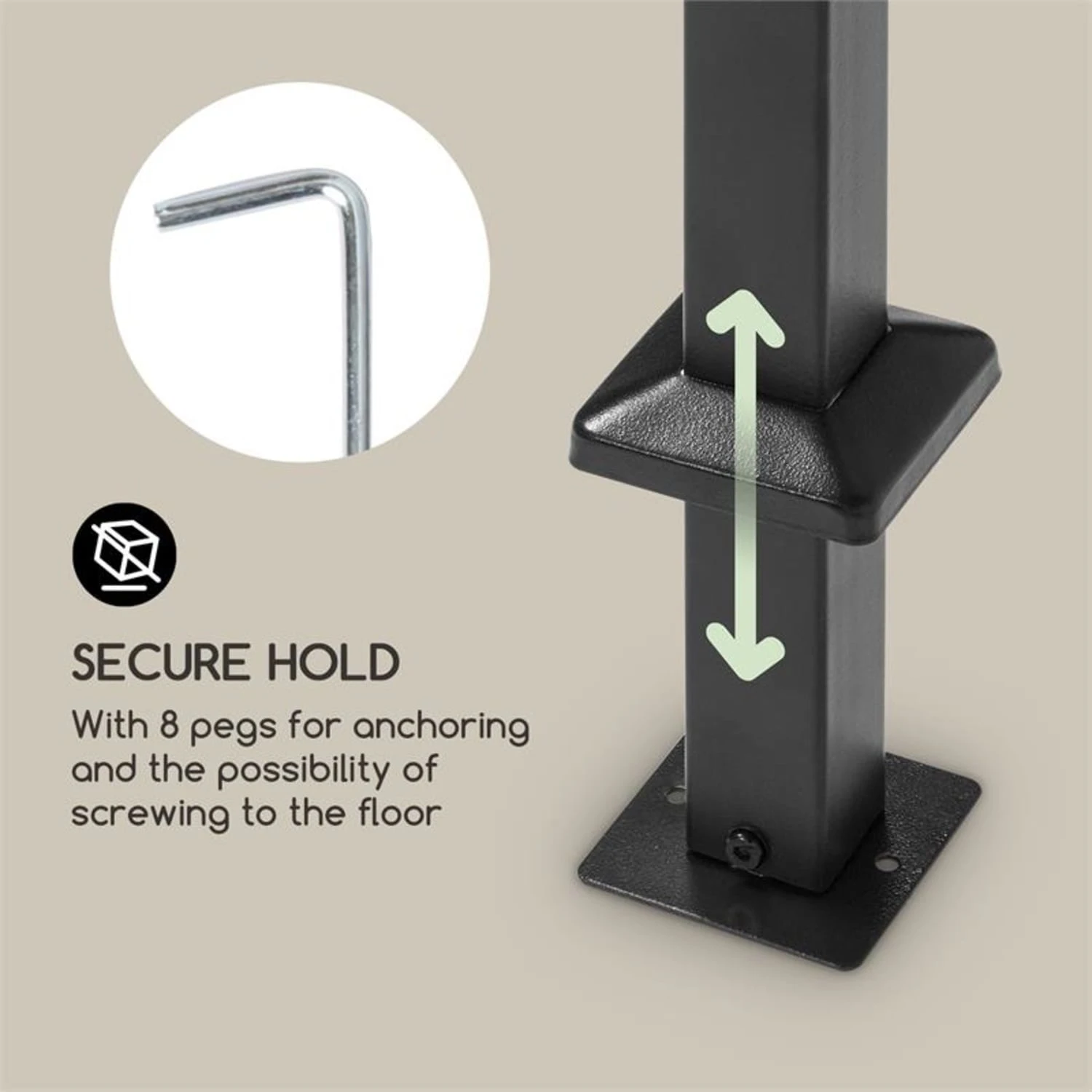 Das Dach des Blumfeldt Steakhouse al Sur schützt mit seinem Material aus 160 g Polyester perfekt vor zu viel Sonne und hält dank PU-Beschichtung auch Regen ab. Natürlich ist das Material flammhemmend behandelt und ermöglicht das Aufstellen des Grills direkt unterhalb des Pavillon. Dank einer praktischen Entlüftungsöffnung kann anfallender Rauch direkt über das Dach entweichen. Für Stabilität sorgt der pulverbeschichtete Stahlrahmenahmen mit 4 x 4 cm Standpfosten, die entweder mit 8 Heringen zum im Boden verankert oder durch Bohrungen ganz einfach mit dem Terrassenboden verschraubt werden.