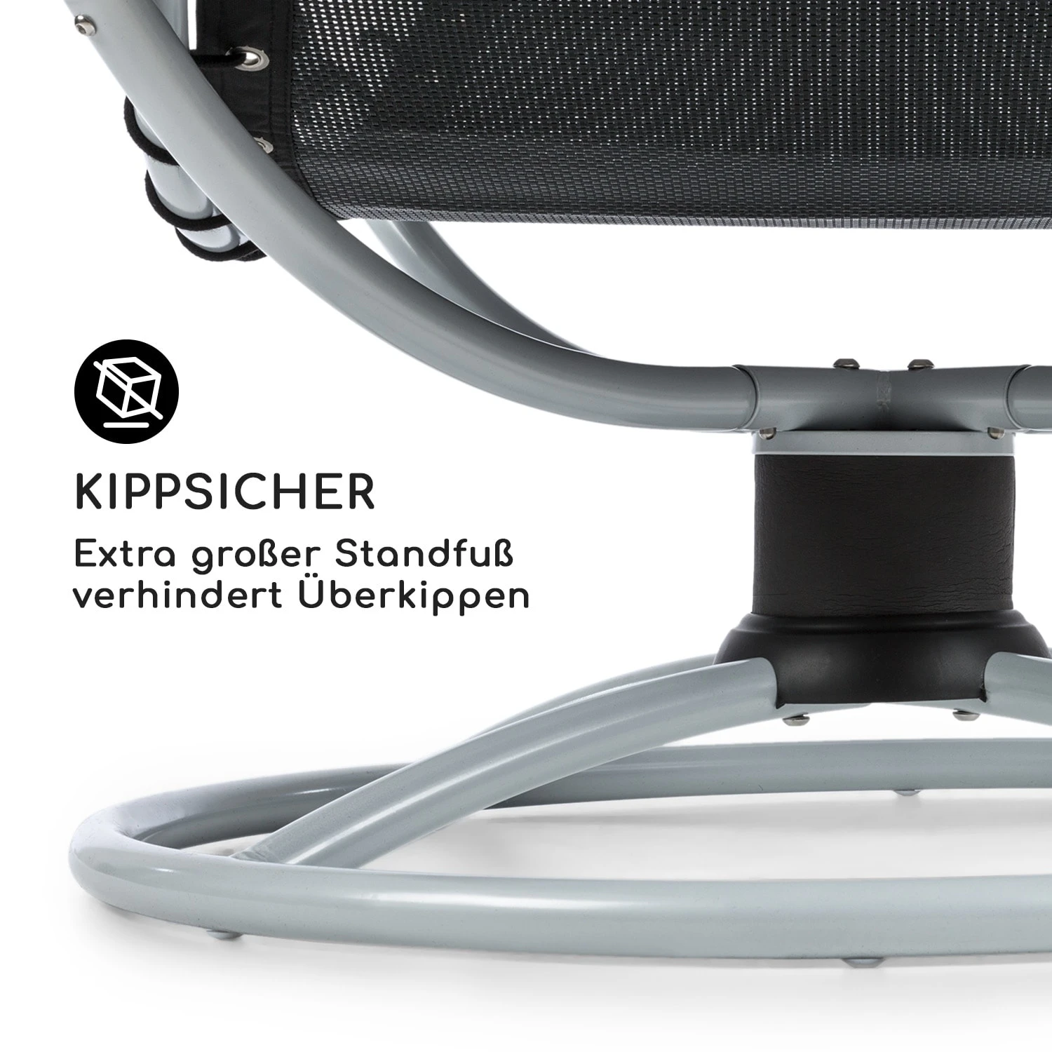 Die Entspannung voll im Auge wurde die Blumfeldt The Chiller Schaukelliege exakt für diesen Zweck designt. 360 Comfort heißt das Konzept, das rundum glücklich macht: Sanft wiegt sich die Liege auf einer perfekt balancierten Spiralfeder, die Schwingbewegungen in alle Richtungen erlaubt. Die bequeme Liegefläche aus luftdurchlässigem ComfortMesh ist ergonomisch geformt und lädt nicht nur zum Relaxen ein, sondern bringt auch gleichzeitig Entspannung für den Rücken. Gummiüberzüge verwandeln den Rahmen zu angenehmen Armablagen. Und egal wie stark der Schaukelstuhl wippt: Der extragroße, 77 cm durchmessende Standfuß verhindert das Überkippen. Für lange Freude am neuen Gartenmöbel sorgt die wasserabweisende Pulverbeschichtung am Rahmen und das witterungsbeständige, leicht abwischbare ComfortMesh der Sitzfläche. So kann The Chiller auch einfach im Freien stehen bleiben, denn das Wetter kann ihm einfach nichts anhaben.