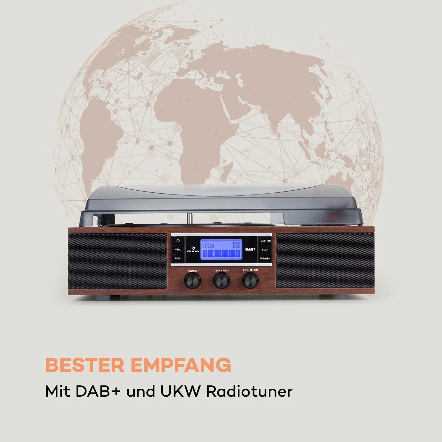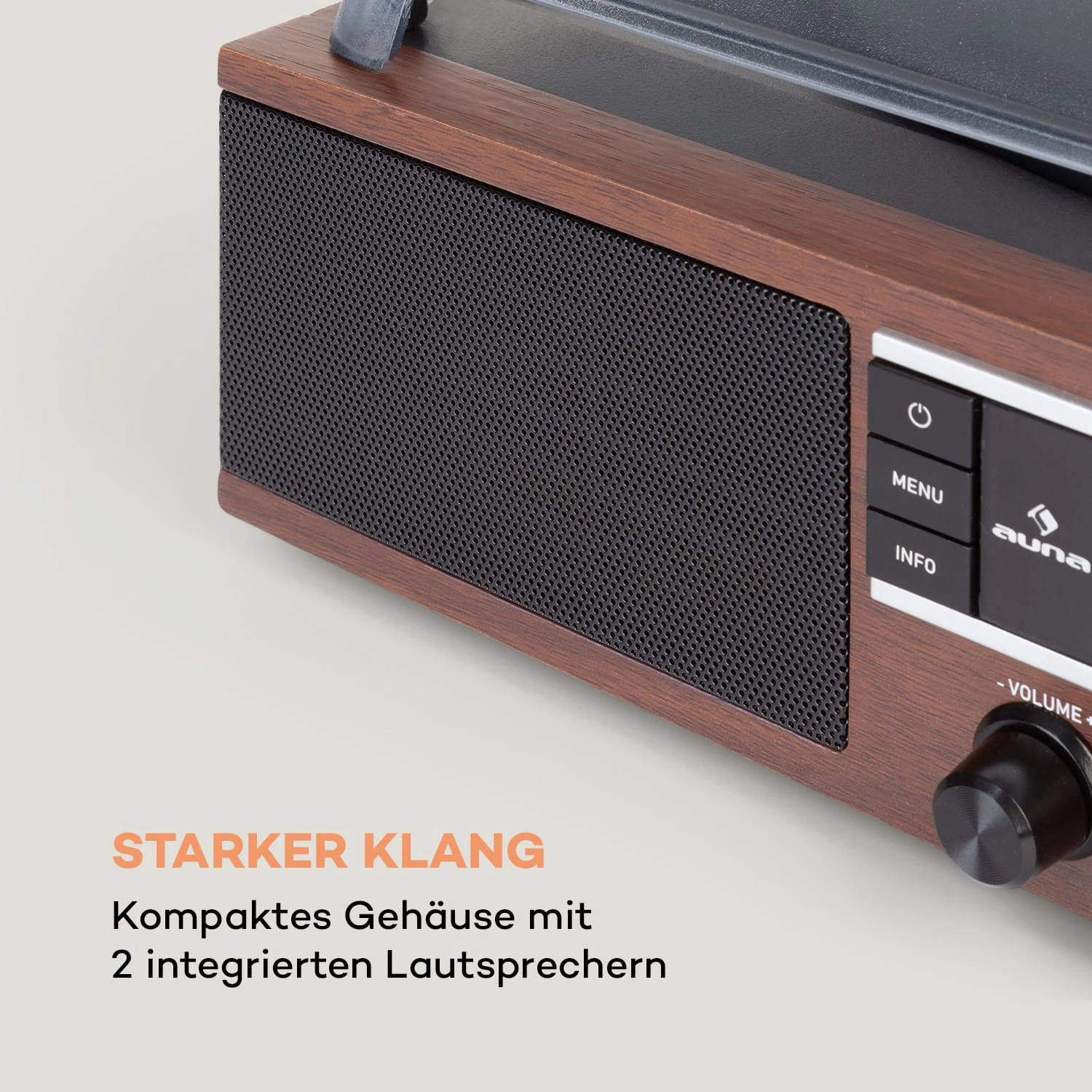 Der auna TT-138 DAB Plattenspieler bietet dank Riemenantrieb, hochwertigem Radioempfang und 2 integrierten Lautsprechern hochwertige Klangerlebnisse für jeden Anlass.