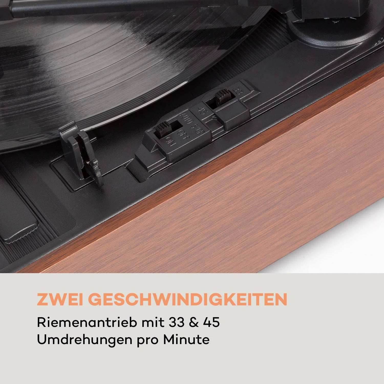 Ausgestattet mit einem Radiotuner für die Empfangsarten DAB+ und FM, können sowohl digitale Sender ohne Rauschunterbrechung als auch lokale Sender mit hoher Klangqualität problemlos empfangen werden. Ein Riemenantrieb mit Geschwindigkeiten von 33 & 45 Umdrehungen pro Minute erlaubt das Abspielen von Langspielplatten und Singles. Ein grundlegender Vorzug des auna Plattenspielers ist das integrierte Lautsprechersystem, durch den das Gerät auch als Stereoanlage fungieren kann. Über einen Line-Ausgang fügt sich der charmante Player ohne Probleme in bereits bestehende HiFi-Systeme ein, um seinen Klangeindruck noch zu verbessern. Zudem kann das kompakte Gerät mit einem Anschluss für FM-Antennen sowie einem schlichten Design in ansprechender Holzoptik überzeugen.