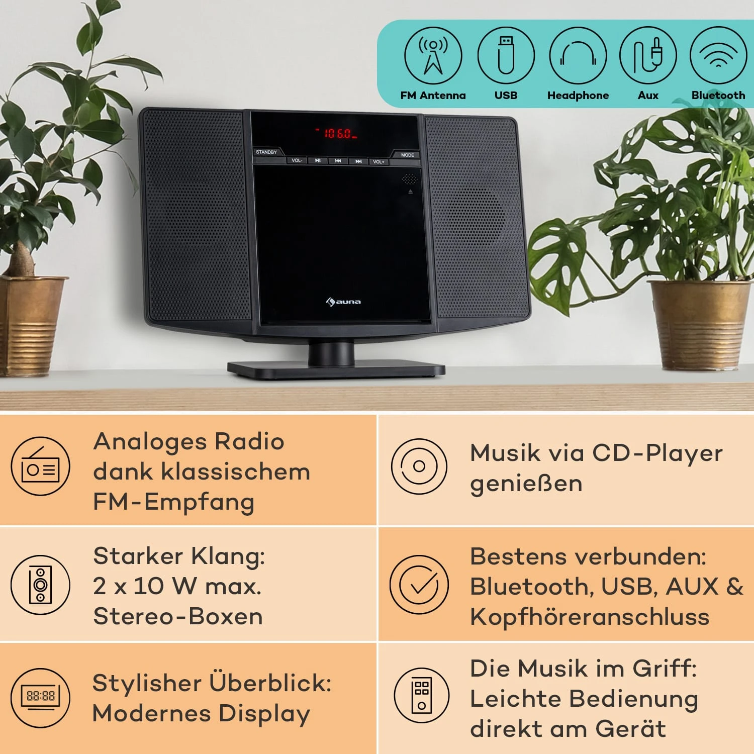 Der erste Blick auf die V14.2 Stereoanlage trifft zunächst den zentral verbauten MP3-fähigen CD-Player, der sich per Knopfdruck automatisch nach oben hin öffnet und die hauseigene CD-Sammlung in Bewegung bringt. Viele Funktionen der formschönen Klangbox mit SlimDesign Concept sind von außen jedoch nicht zu erkennen: eine Bluetooth-Verbindung ermöglicht beispielsweise das drahtlose und bequeme Abspielen aller Audio-Dateien von Smartphone oder Tablet. Der FM-Radiomodus garantiert zusätzlich den zuverlässigen Empfang aller lokalen Signale in hoher Klangqualität und stellt zahlreiche Senderspeicherplätze zur Verfügung, um die Lieblingssender auf Knopfdruck parat zu haben. Über einen USB-Port sowie den AUX-Klinken-Eingang können an die auna V14.2 Vertikal-Stereoanlage zudem alle erdenklichen Arten externer Audio-Equipments angeschlossen werden. Dank integrierter Uhr mit Weckfunktion bietet sich die Anlage auch perfekt zur Aufstellung in Schlafbereichen oder zur Nutzung als musikalische Küchenuhr an. Der Alarm erfolgt dabei via Signalton, Radiosender oder direkt per CD.