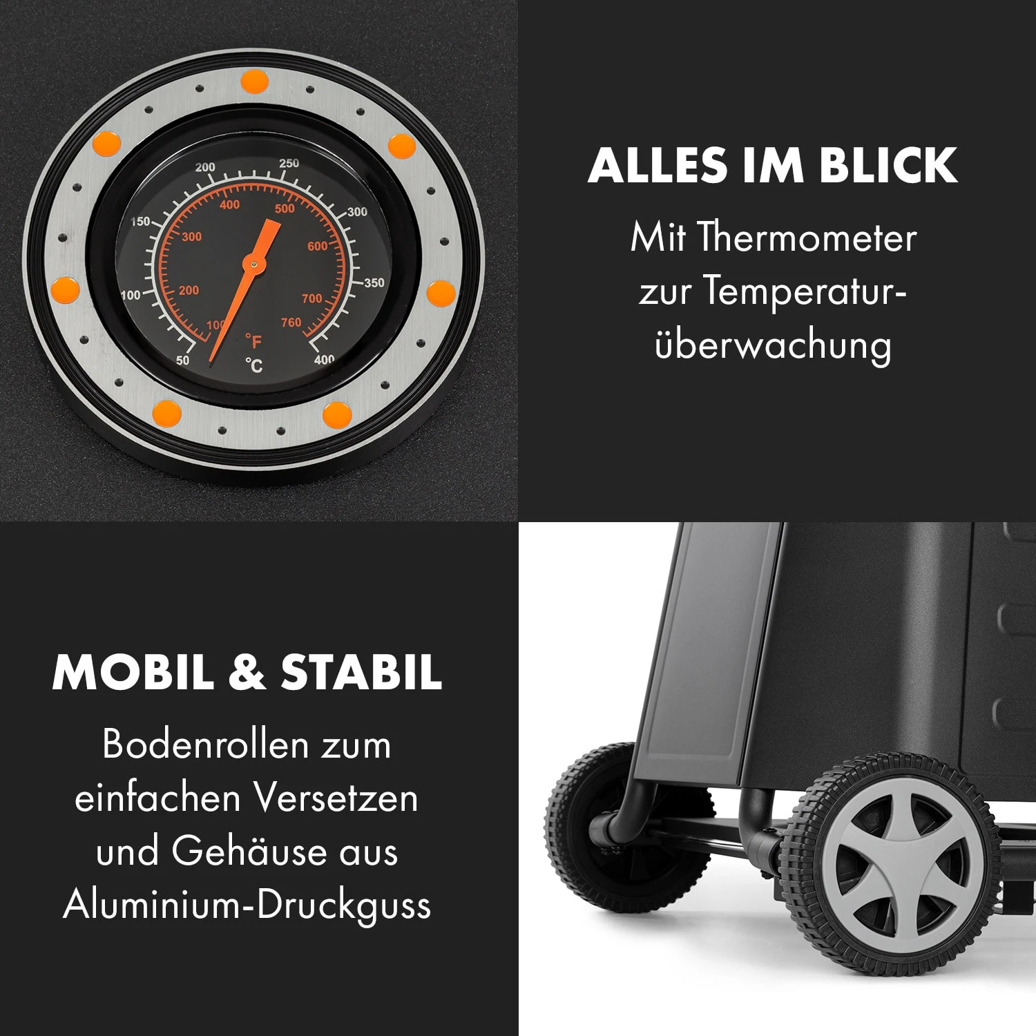 Besonders praktisch für den Grillmeister sind die beiden einklappbaren Seitentische am Klarstein Vanquish Gasgrill. Hier kannst du nicht nur Gewürze, Grillgut oder Marinaden bereitstellen, sondern hast auch direkt dein kühles Getränk beim heißen Bratgeschäft griffbereit. Praktische Haken an den Seiten bieten die Möglichkeit, verschiedene Grillutensilien griffbereit einzuhängen. Nach dem Grillen werden die Tische einfach nach unten geklappt und der Vanquish dank Bodenrollen zu seinem gewünschten Aufbewahrungsort gebracht.